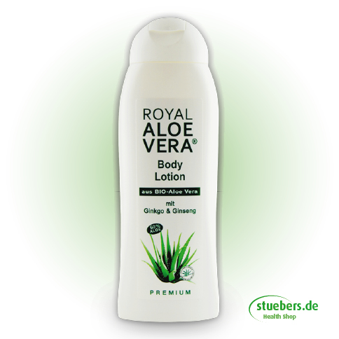 Royal Aloe Vera Body Lotion ist eine Stimulierende Körperlotion mit 60% Bio Aloe Vera, Ginkgo und Ginseng, Vitamin E, Vitamin B3 und Panthenol.